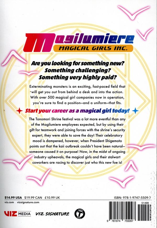 Volume 9 - 1st printing. Written by Sekka Iwata. Art and cover by Yu Aoki. Translated by Camellia Nieh. There's never a dull day at the office when you're a magical girl! Are you looking for something new? Something challenging? Something very highly paid? Exterminating monsters is an exciting, fast-paced field that will get you out from behind a desk and into the action. With over 500 magical girl companies now in operation, you're sure to find a position-and a uniform-that fits. Start your career as a magical girl today! As the push to deregulate magic power continues, certain factions are willing to go to any extreme to further their agenda-including unleashing an artificial kaii on Tokyo Bay! Magilumiere tries to take on the unnatural beast, but Ast shows up out of the blue with a new device that seems to make short work of the kaii...right up until it comes back to life. With Ast's and her own reputation on the line, Tsuchiba is determined to finish the job no matter the cost. Can Kana and her coworkers keep this unprecedented extermination from turning deadly? Softcover, 5 3/4-in. x 8 1/4-in., 200 pages, B&W. Teen Cover price $14.99.