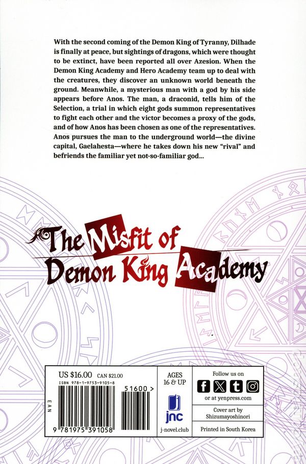 Volume 4 - Act 1 - 1st printing. Written by Shu. Art and cover by Yoshinori Shizuma. The war between demon and man has been successfully thwarted, marking the students return to the Demon King Academy. If only peace were so easy to obtain. The people of Dilhade must now face the truth about the long-awaited Demon King and adjust to the abolishment of royalty. Anos must tread carefully—for old enemies, and even old friends, have been awaiting his return. A familiar face from two thousand years ago then arrives at the Demon King Academy—but hes somehow been possessed by a god! Nosgalia the Heavenly Father, who opposed Anos during the Mythical Age, swears to impose his downfall and return order to the world. But can order truly fight the foe that abolishes all reason? Find out in the fourth installment of The Misfit of Demon King Academy, the Great Spirit Arc! Softcover, 5-in. x 7-in., 296 pages, Text (with B&W Chapter Illustrations). Ages 16+ Cover price $15.00.
