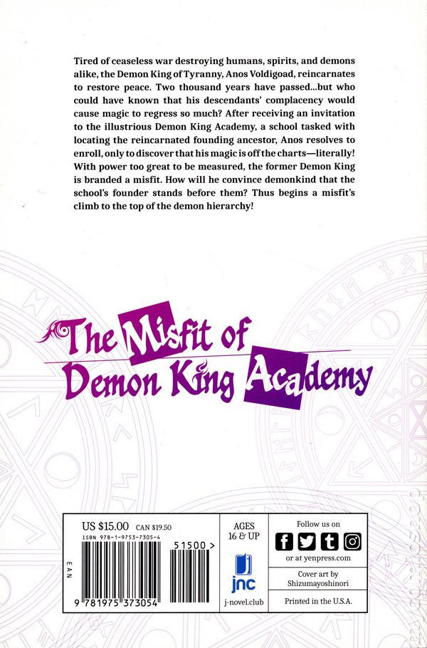 Volume 1 - 1st printing. Written by Shu. Art and cover by Yoshinori Shizuma. Translated by Mana Z. What if you were the strongest demon king in history...but nobody believed you? A light-hearted action rom-com series wherein the devil is definitely not getting his due. Anoth, the Demon King of Tyranny, has defeated humans, spirits, and gods alike. But even demon kings get tired of all the fighting sometimes! Hoping for a more peaceful life, Anoth decides to reincarnate himself. When he wakes two thousand years later, though, he finds the world has become too peaceful--his descendants have grown weak and magic is in serious decline. Intending to reclaim his rightful place, he enrolls in Demon King Academy, where he finds that his magical power is off the charts. Literally. And because they can't measure his power, the faculty and other students regard Anoth as a misfit. With the support of Misha, the one student he manages to befriend, the misfit (Demon King) begins his climb up the demon ranks! Softcover, 5-in. x 7-in., 224 pages, Text (with B&W Chapter Illustrations). Ages 16+ Cover price $15.00.