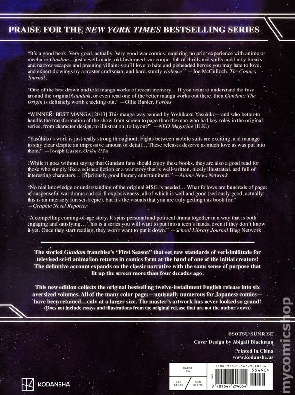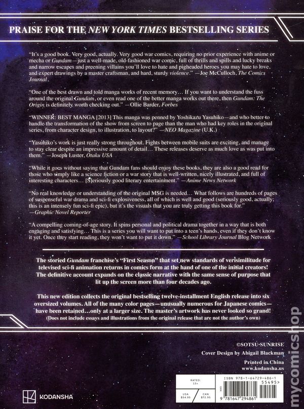 Volume 2 - 1st printing. Original Story by Yoshiyuki Tomino and Hajime Yatate. Mechanical Design by Kunio Okawara. The classic Gundam series now in a premium Deluxe Edition hardcover! PRAISE FOR THE NEW YORK TIMES BESTSELLING SERIES: Its a good book. Very good, actually. Very good war comics, requiring no prior experience with anime or mecha or Gundam—just a well-made, old-fashioned war comic, full of thrills and spills and lucky breaks and narrow escapes and preening villains youll love to hate and pigheaded heroes you may hate to love, and expert drawings by a master craftsman, and hard, sturdy violence. —Joe McCulloch, The Comics Journal One of the best drawn and told manga works of recent memory… If you want to understand the fuss around the original Gundam, or even read one of the better manga works out there, then Gundam: The Origin is definitely worth checking out. —Ollie Barder, Forbes WINNER: BEST MANGA [2013] This manga was penned by Yoshikazu Yasuhiko—and who better to handle the transformation of the show from screen to page than the man who had key roles in the original series, from character design, to illustration, to layout? —NEO Magazine (U.K.) Yasuhikos work is just really strong throughout. Fights between mobile suits are exciting, and manage to stay clear despite an impressive amount of detail… These releases deserve as much love as was put into them.—Joseph Luster, Otaku USA While it goes without saying that Gundam fans should enjoy these books, they are also a good read for those who simply like a science fiction or a war story that is well-written, nicely illustrated, and full of interesting characters… [S]eriously good literary entertainment. —Anime News Network No real knowledge or understanding of the original MSG is needed… What follows are hundreds of pages of suspenseful war drama and sci-fi explosiveness, all of which is well and good (seriously good, actually; this is an intensely fun sci-fi epic), but its the visuals that you are truly getting this book for. —Graphic Novel Reporter A compelling coming-of-age story. It spins personal and political drama together in a way that is both engaging and satisfying… This is a series you will want to put into a teens hands, even if they dont know it yet. Once they start reading, they wont want to put it down. —School Library Journal Blog Network The storied Gundam franchises First Season that set new standards of verisimilitude for televised sci-fi animation returns in comics form at the hand of one of the initial creators! The definitive account expands on the classic narrative with the same sense of purpose that lit up the screen more than four decades ago. This new edition collects the original bestselling twelve-installment English release into six oversized volumes. All of the many color pages—unusually numerous for Japanese comics—have been retained…only at a larger size. The masters artwork has never looked so grand! Hardcover, 7 3/4-in. x 10 1/4-in., 976 pages, B&W. NOTE: Does not include essays and illustrations from the original release that are not the authors own. Cover price $54.95.