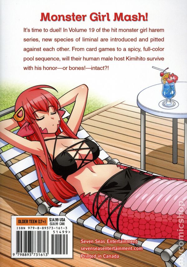 Volume 19 - 1st printing. Story and art by Okayado. Translated by Andrew Cunningham. It's time to duel! In Volume 19 of the hit monster girl harem series, new species of liminal are introduced and pitted against each other. From card games to a spicy, full-color pool sequence, will their human male host Kimihito survive with his honor-or bones!-intact?! Softcover, 5-in. 7-in., 156 pages, B&W. Mature Readers Cover price $14.99.