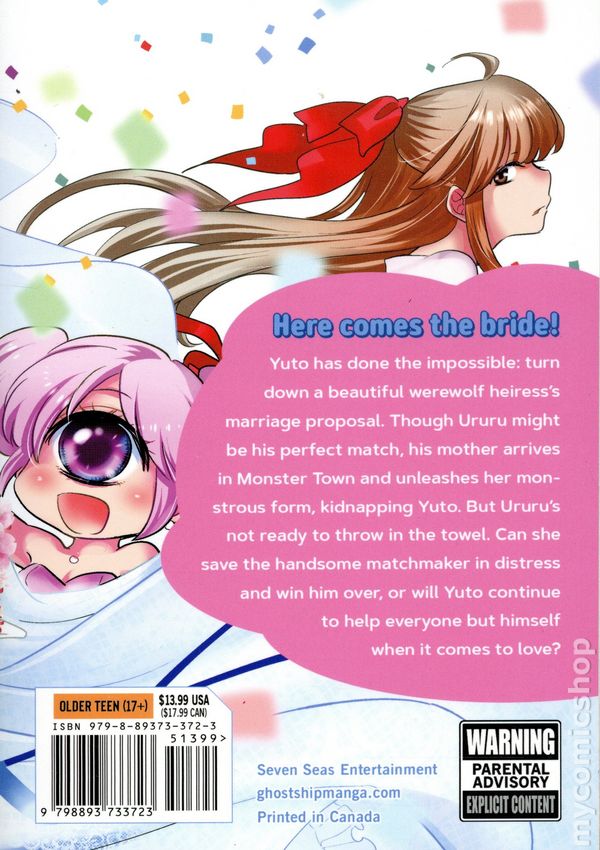 Volume 1 - 1st printing. Story and art by Kaworu Watashiya. Translated by Katrina Leonoudakis. Adapted by David Lumsdon. Monster girls need love too in this rom-com manga! A marriage advisor has his work cut out for him when he winds up the matchmaker for sexy, single monster ladies. After growing up watching an endless parade of losers date his mom, Nakao Yuto focuses his unhealthy obsession with her on matchmaking. One day, he stumbles into the hidden gem of Monster Town, where he meets all sorts of hopeful supernatural singles in need of his services. A rich werewolf, a call girl succubus, a small-time idol vampire, and a yaoi-obsessed gorgon beg for help with their love lives. However, Yuto quickly finds himself on everyone's potential match list! Softcover, 5-in. x 7-in., 184 pages, B&W. Older Teen (17+) Cover price $13.99.