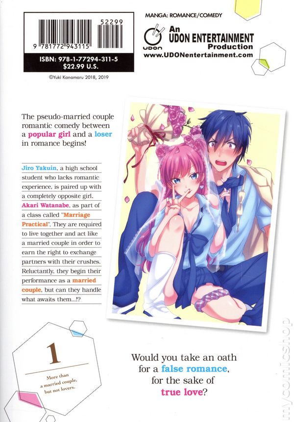 Volume 1 - 1st printing. Story and art by Yuki Kanamaru. Translated by Adrienne Beck. Would you take an oath for a false romance, for the sake of true love? The pseudo-married couple romantic comedy between a popular girl and a loser in romance begins! Jiro Yakuin, a high school student who lacks romantic experience, is paired up with a completely opposite girl, Akari Watanabe, as part of a class called "Marriage Practical". They are required to live together and act like a married couple in order to earn the right to exchange partners with their crushes. Reluctantly, they begin their performance as a married couple, but can they handle what awaits them...!? Softcover, 5-in. x 7-in., 384 pages, B&W. Cover price $22.99.