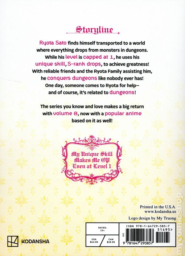 Volume 8 - 1st printing. Written by Nazuna Miki. Art and cover by Subachi. Translated by Benjamin Daughety. Ryota Sato gets the surprise of his life when he's suddenly transported into another world and nearly clobbered at the hands of the young, pretty adventurer Emily Brown. This new world revolves around defeating monsters and profiting off whatever they drop-food, money, items, and more. Unfortunately for Ryota, he has no skills to speak of... until he learns he has otherworldly drop luck that brings him never-before-seen items! Suddenly his luck turns around... or does it? Softcover, 5-in. x 7-in., 244 pages, Text (with B&W Chapter Illustrations). Rated 13+ Cover price $14.95.