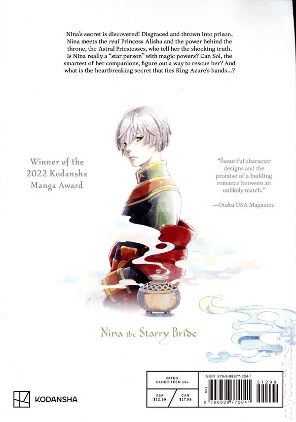 Volume 12 - 1st printing. Story and art by RIKACHI. Nina was plucked off the streets because she resembled a dead priestess--but is this a lucky break, or a new kind of curse? Winner of the Kodansha Manga Award, this fantasy shojo manga features intertwining constellations of palace intrigue and perilous romance, for fans of The Ancient Magus' Bride, The Apothecary Diaries, and Snow White With the Red Hair. Nina had a rough start to life, orphaned and stealing to survive, only to be abducted for her unusual lapis lazuli eyes. But to her surprise, her captor, Prince Azure, ordained that she would live the life of a princess...specifically, that of the recently deceased princess-priestess, Alisha, who had her same eyes. Despite her changing fortune, Nina won't give up her old life without a fight. Azure might just be the one to finally match her wits, but how much can she trust him? And can she stop the feelings budding in her heart, knowing she must eventually marry another...? Softcover, 5 1/2-in. x 7-in., 176 pages, B&W. Older Teen (16+) Cover price $12.99.
