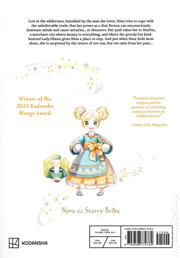 Volume 1 - 1st printing. Story and art by RIKACHI. Winner of the Kodansha Manga Award, this fantasy shojo manga features intertwining constellations of palace intrigue and perilous romance, for fans of The Ancient Magus' Bride, The Apothecary Diaries, and Snow White With the Red Hair. Nina had a rough start to life, orphaned and stealing to survive, only to be abducted for her unusual lapis lazuli eyes. But to her surprise, her captor, Prince Azure, ordained that she would live the life of a princess... specifically, that of the recently deceased princess-priestess, Alisha, who had her same eyes. Despite her changing fortune, Nina won't give up her old life without a fight. Azure might just be the one to finally match her wits, but how much can she trust him? And can she stop the feelings budding in her heart, knowing she must eventually marry another? Softcover, 5 1/2-in. x 7-in., 176 pages, B&W. Older Teen (16+) Cover price $12.99.
