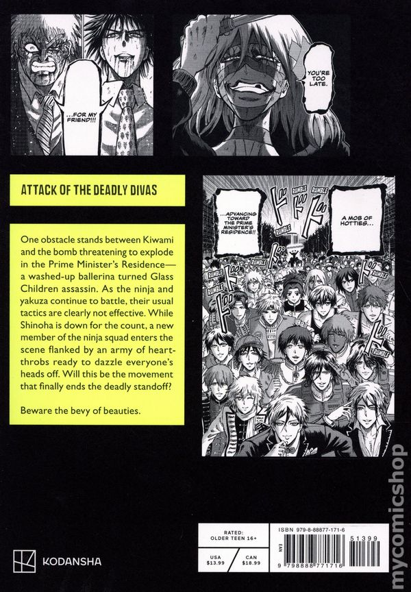 Volume 8 -1st printing. Story and art by Shinsuke Kondo. One obstacle stands between Kiwami and the bomb threatening to explode in the Prime Minister's Residence-a washed-up ballerina turned Glass Children assassin. As the ninja and yakuza continue to battle, their usual tactics are clearly not effective. While Shinoha is down for the count, a new member of the ninja squad enters the scene flanked by an army of heartthrobs ready to dazzle everyone's heads off. Will this be the movement that finally ends the deadly standoff? Softcover, 6-in. x 8-in., 192 pages, B&W. Older Teen 16+ Cover price $13.99.