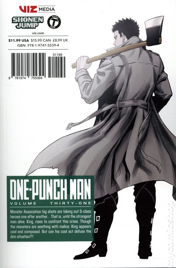 Volume 31 - 1st printing. Written by One. Art and cover by Yusuke Murata. Adapted by John Werry. Monster Association big shots are taking out S-class heroes one after another.. That is, untilthe strongest man alive, King, rises to confront this crisis. Though the monsters are seething with malice, King appears cool and composed. But can his cool act defuse the dire situation? Softcover, 5-in. x 7-in., 224 pages, B&W. Teen Cover price $11.99.