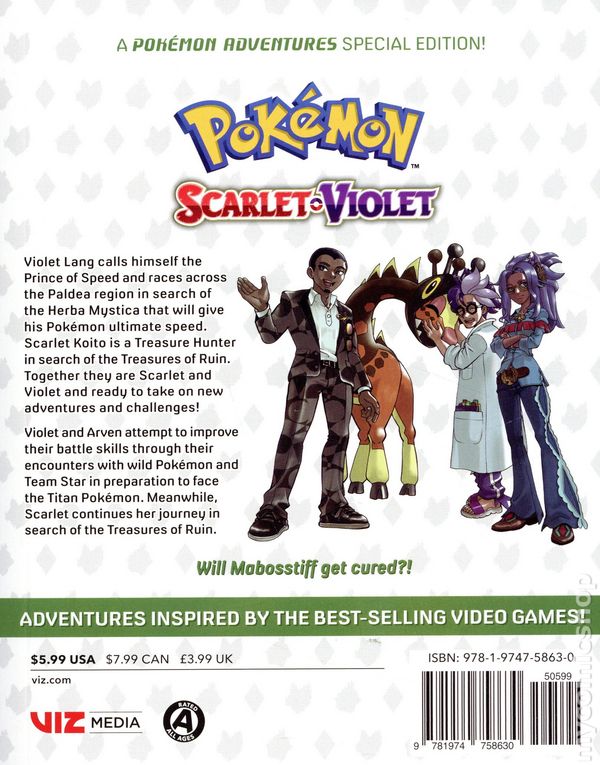 Volume 1 - 1st printing. Written by Hidenori Kusaka. Art and cover by Satoshi Yamamoto. Translated by Tetsuichiro Miyaki. Adapted by Molly Tanzer. Violet Lang calls himself the Prince of Speed and races across the Paldea region in search of the Herba Mystica that will give his Pokémon ultimate speed. Meanwhile, Scarlet Kioto is a Treasure Hunter in search of the Treasures of Ruin. As the two travel the Paldea region, a new adventure begins! Are you ready for the Treasure Hunt?! Softcover, 5 1/2-in. x 7-in., 96 pages, B&W. All Ages Cover price $5.99.