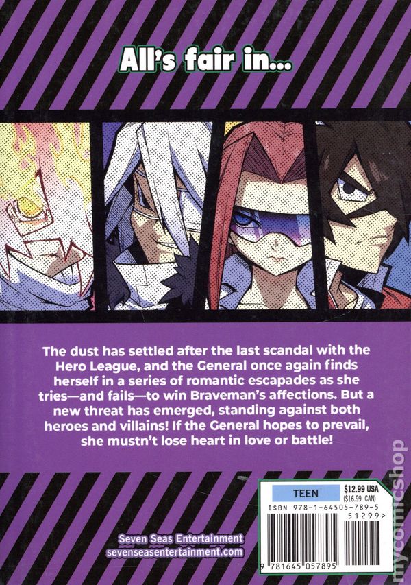 Volume 6 - 1st printing. Story and Art by Jin. Translated by Timothy MacKenzie. Adapted by T. Campbell. The dust has settled after the last scandal with the Hero League, and the General once again finds herself in a series of romantic escapades as she tries—and fails—to win Bravemans affections. But a new threat has emerged, standing against both heroes and villains! If the General hopes to prevail, she mustnt lose heart in love or battle! Softcover, 5-in. x 7-in., 180 pages, B&W. Teen (13+) Cover price $12.99.