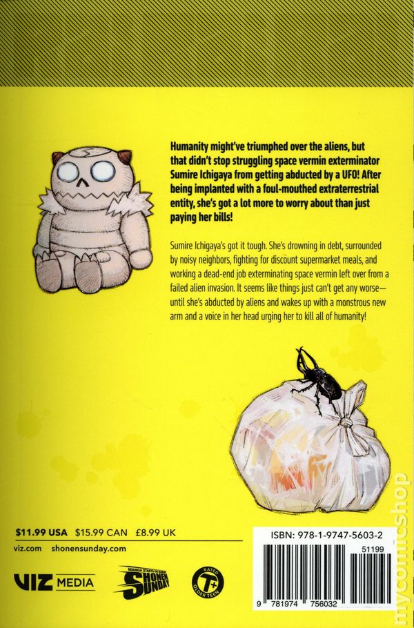 Volume 1 - 1st printing. Story and art by Yoshiaki. Implanted with an extraterrestrial entity, a former space pest exterminator battles deadly alien threats-all to pay her bills! Sumire Ichigaya's got it tough. She's drowning in debt, surrounded by noisy neighbors, fighting for discount supermarket meals, and working a dead-end job exterminating space pests leftover from a failed alien invasion. It seems like things just can't get any worse-until she's abducted by aliens and wakes up with a monstrous new arm and a foul-mouthed voice in her head! All Sumire wanted to do was work her way out of debt-and maybe stop getting abducted by UFOs-but now that she's host to a massive alien arm with a mind of its own...well, she still got bills to pay, but now she's also got to worry about freaky extraterrestrial monsters and a company full of alien exterminators just waiting to autopsy her! Softcover, 5-in.x 7-in., 200 pages, B&W. Cover price $11.99.