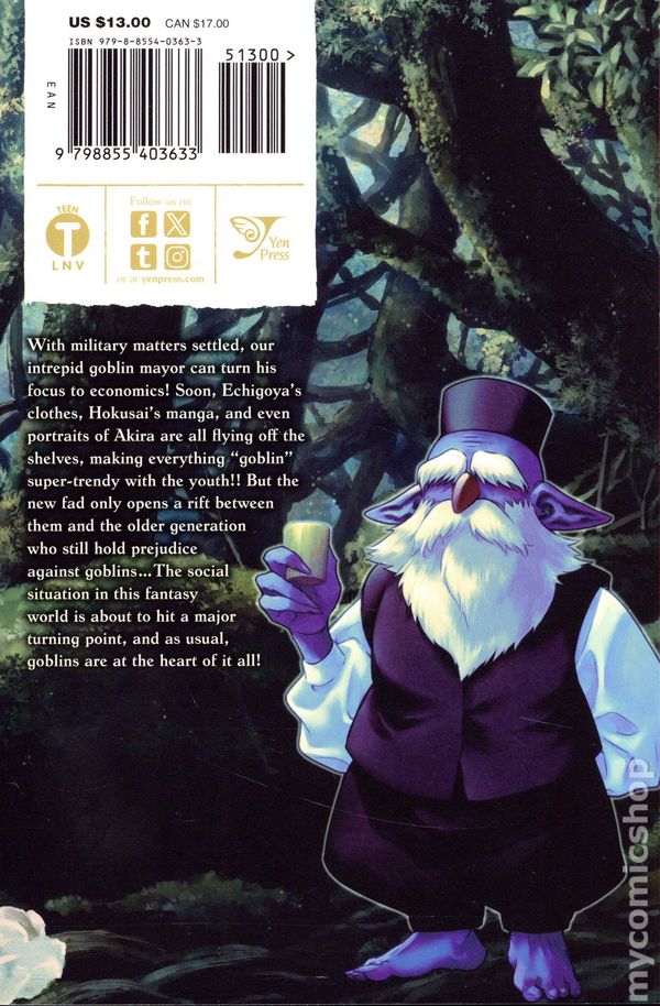 Volume 8 - 1st printing. Written by Nazuna Miki. Art and cover by Tsukasa Araki. Translated by Caleb D. Cook. With military matters settled, our intrepid goblin mayor can turn his focus to economics! Soon, Echigoya's clothes, Hokusai's manga, and even Akira's bromides are all flying off the shelves, making everything "Goblin" super-trendy with the youths!! But that only opens a rift between them and the older generation that still holds prejudice against goblins... The social situation in this fantasy world is about to hit a major turning point, and as usual, goblins are at the heart of it all! Softcover, 5-in. x 7-in., 228 pages, B&W. Teen Cover price $13.00.