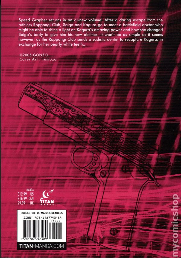 Volume 2 - 1st printing. Story and art by Tomozo. Based on the Story by Gonzo. Original Chacrater Design by Yusuke Kozaki. Translated by Motoko Tammuro and Jonathan Clements. SPEED GRAPHER RETURNS IN AN ALL-NEW VOLUME! After a daring escape from the sadistic Roppongi Club, Saiga and Kagura go to meet a battlefield doctor who might be able to shine a light on Kagura's amazing power and how she changed Saiga's body to give him his new abilities. It won't be as simple as it seems however, as the Roppongi Club sends a sadistic dentist to recapture Kagura, in exchange for her pearly white teeth! Softcover, 5-in. x 7-in., 192 pages, B&W. Mature Readers Cover price $12.99.