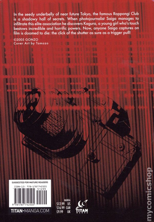 Volume 1 - 2nd and later printings. Story and art by Tomozo. Based on the Story by Gonzo. Original Chacrater Design by Yusuke Kozaki. Translated by Motoko Tammuro and Jonathan Clements. A DARK, GRITTY STORY OF PHOTOJOURNALIST SAIGA AND THE YOUNG KAGURA ... In the seedy underworld of a supernatural Tokyo, a troubled former war photographer attempts to save a gifted fifteen-year-old girl from a sinister cabal that wants to exploit her powers. Softcover, 5-in. x 7-in., 192 pages, B&W. Mature Readers Cover price $12.99.