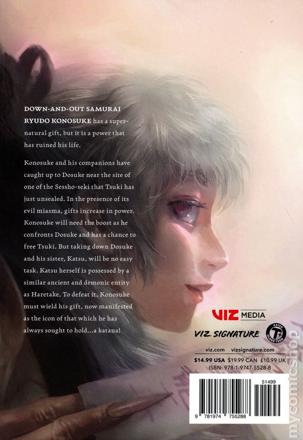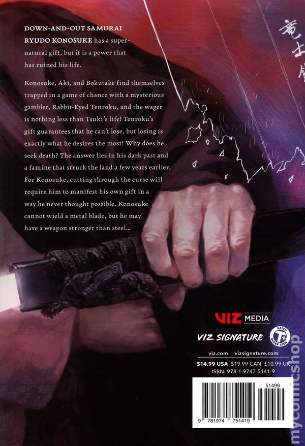 Volume 6 - 1st printing. Story and art by Daruma Matsuura. Translated by Caleb Cook. A down-and-out samurai who can't even hold a sword enters a strange world of magic searching for honor and redemption. Down-and-out samurai Ryudo Konosuke has a supernatural gift, but it is a power that has ruined his life. Konosuke, Aki, and Bokutake find themselves trapped in a game of chance with a mysterious gambler, Rabbit-Eyed Tenroku, and the wager is nothing less than Tsuki's life! Tenroku's gift guarantees that he can't lose, but losing is exactly what he desires the most! Why does he seek death? The answer lies in his dark past and a famine that struck the land a few years earlier. For Konosuke, cutting through the curse will require him to manifest his own gift in a way he never thought possible. Konosuke cannot wield a metal blade, but he may have a weapon stronger than steel... Softcover, 5-in. x 7-in., 192 pages, B&W. Teen+ Cover price $14.99.