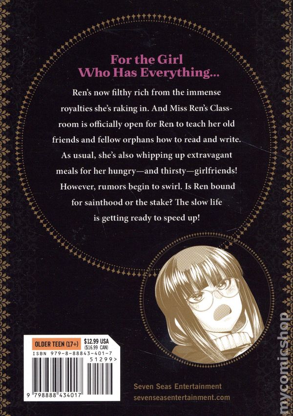 Volume 11 - 1st printing. Story and art by Ashi. Translated by Jshua Hardy. Adapted by Solo Mia. Ren's now filthy rich from the immense royalties she's raking in. And Miss Ren's Classroom is officially open for Ren to teach her old friends and fellow orphans how to read and write. As usual, she's also whipping up extravagant meals for her hungry-and thirsty-girlfriends! However, rumors begin to swirl. Is Ren bound for sainthood or the stake? The slow life is getting ready to speed up! Softcover, 5-in. x 7-in., 160 pages, B&W. Older Teen 17+ Cover price $12.99.