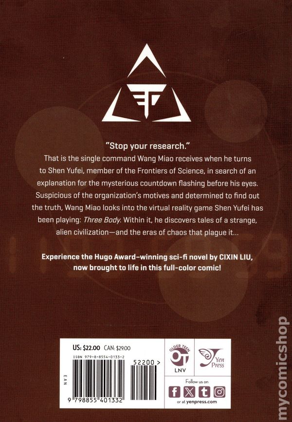 Volume 2 - 1st printing. Based on the Story by Cixin Liu. Adapted by Jin Cai, Twilight Lu, and Silver. Art and cover by XuDong Cai. Translated by Xiao. Wang Miao delves deeper into the Frontiers of Science, seeking understanding of their goals and the nature of the mysterious countdown flashing before his eyes. But he receives nothing but a cryptic command—Stop your nanomaterial research. Uncertain whether to trust Shen Yufeis words, Wang Miao decides to test out the virtual reality game shes been playing, and in it, he discovers tales of a strange, alien civilization… Softcover, 5 3/4-in. x 8 1/2-in., 192 pages, full color. Older Teen Cover price $22.00.