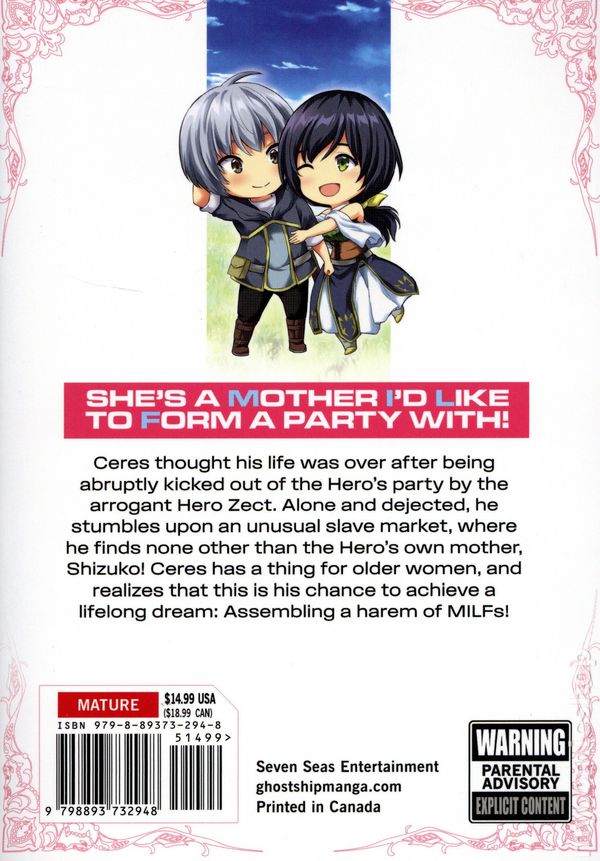 Volume 1 - 1st printing. Written by Ishino Yassan. Art and cover by Makoto Kuon. Translated by Matthew Carolan. Ceres thought his life was over after being abruptly kicked out of the Hero's party by the arrogant Hero Zect. Alone and dejected, he stumbles upon an unusual slave market, where he finds none other than the Hero's own mother, Shizuko! Ceres has a thing for older women, and realizes that this is his chance to achieve a lifelong dream: Assembling a harem of MILFs! Get ready for hot moms and revenge in this fantasy isekai tale! Softcover, 5-in.x 7-in., 188 pages, B&W. Mature Readers Cover price $14.99.