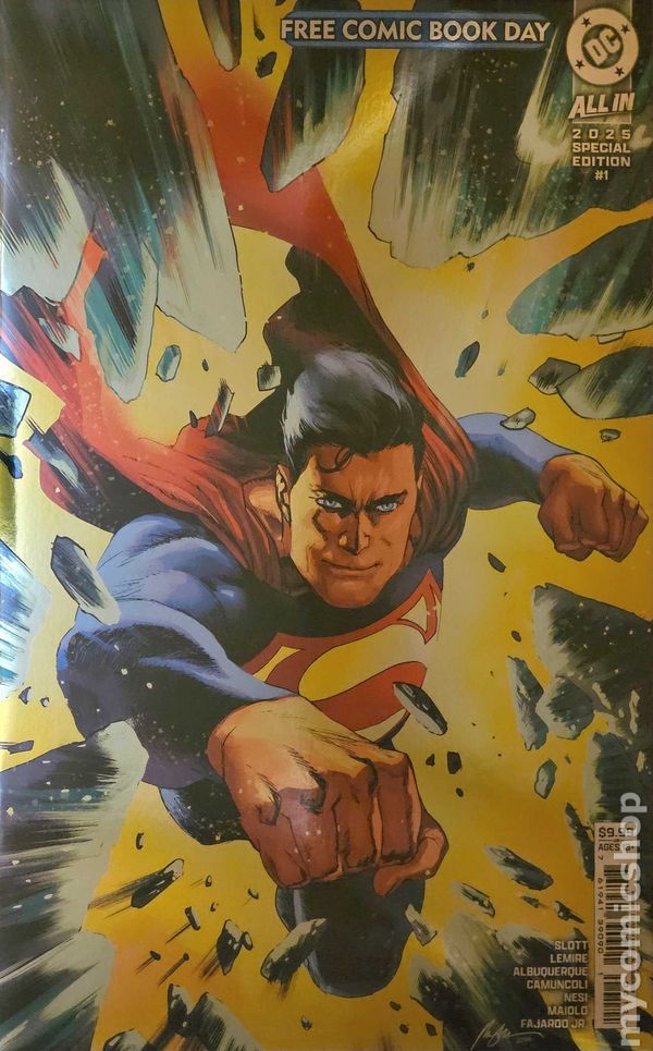 Foil Cover. Written by Dan Slott and Jeff Lemire. Art and Flip Covers by Rafael Albuquerque, Giuseppe Camuncoli and Stefano Nesi. The DC All In saga explodes into a brand-new Free Comic Book Day flipbook! First up, the core-line DC Universe soars into Superman action with "In the Blink of an Eye," the dazzling debut of superstar writer Dan Slott alongside acclaimed artist Rafael Albuquerque! In this special zero issue installment of the forthcoming Superman Unlimited series, you will witness the prelude to the biggest Superman comic book adventure of the year, as well as an ominous new threat from the heavens that will change the course of Kryptonian life on planet Earth as we know it! Then, in "Mirror, Mirror" by Jeff Lemire, Giuseppe Camuncoli and Stefano Nesi, as the Absolute Universe expands, dark forces begin to gather in the shadows...forces that have been waiting a very long time to shape events and seize control. All the while, a mysterious figure watches -- but who is this powerful new character, and what do they want with Superman, Batman, Wonder Woman, and the rest of the emerging heroes? 32 pages, full color. Ages 13+ Cover price $9.99.