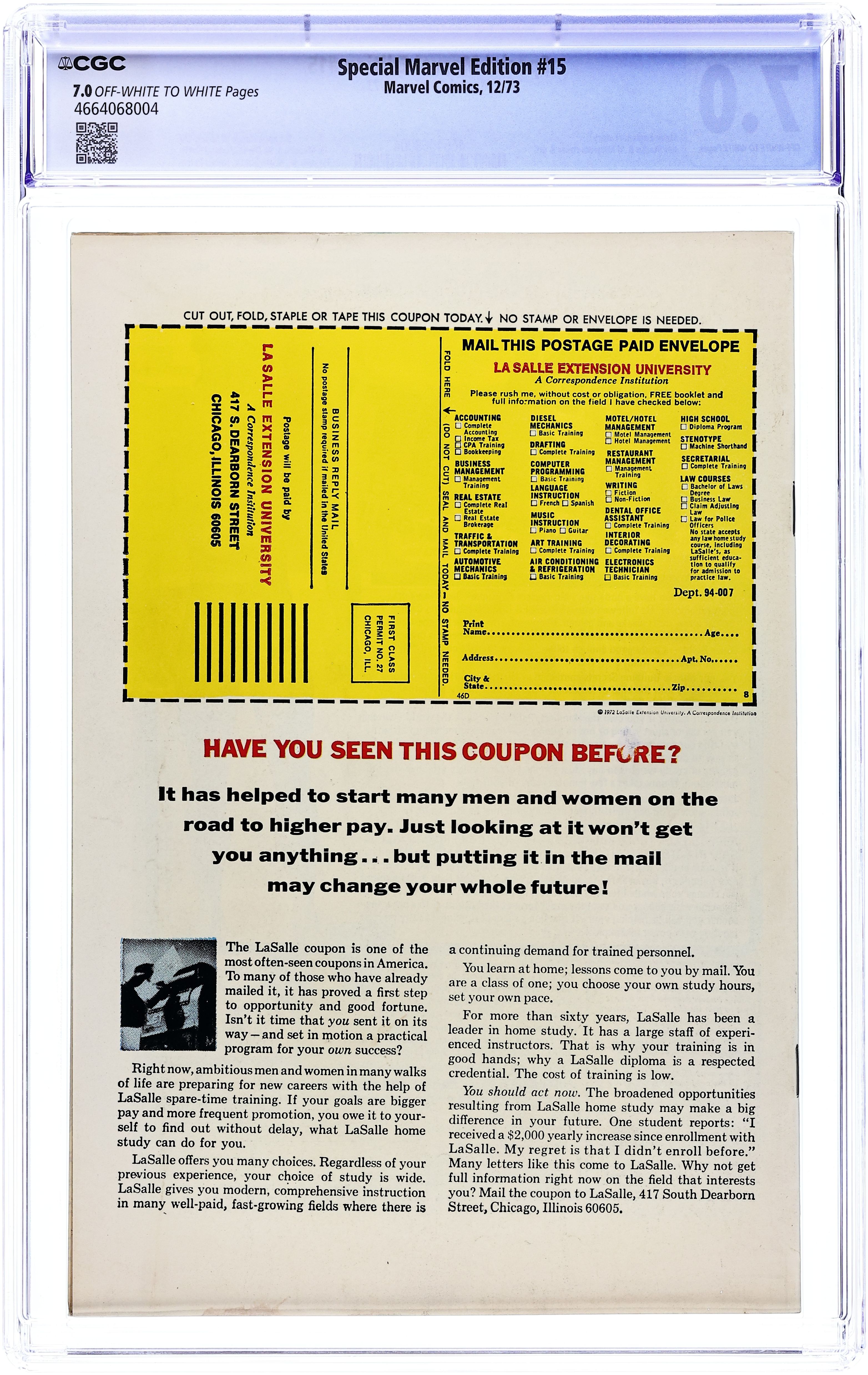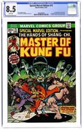 Starts Dec 8 Written by Steve Englehart and Jim Starlin. Art and cover by Jim Starlin and Al Milgrom. Shang Chi, making his first appearance, is a master of martial arts and the son of Fu Manchu, a Chinese mandarin and scientist. Fu Manchu sends Shang Chi to England in order to assassinate the evil Dr. Petrie for the common good. Shang Chi reluctantly agrees, but after the deed is done he is confronted by Sir Denis Nayland Smith, a former British intelligence officer who tells him the truth about Fu Manchu; that he is a nearly immortal evil mastermind. Shang Chi travels back to his father's secret lair in New York and renounces him. Text articles by Roy Thomas and Englehart about the creation of Shang-Chi. Ad for Astonishing Tales #21. A brief obituary for Syd Shores. Ad for the Marvel fan club FOOM (Friends of Ol' Marvel). 36 pages, full color. $0.20. Cover price $0.20.