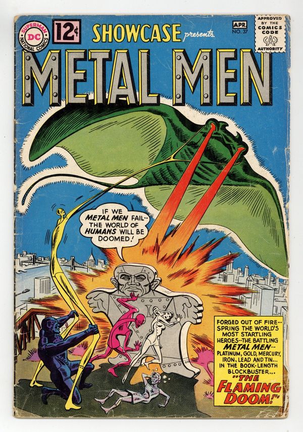Starts Dec 8 Cover pencils by Ross Andru, inks by Mike Esposito. 1st appearance of the Metal Men in The Flaming Doom! (Part I), script by Robert Kanigher, pencils by Ross Andru, inks by Mike Esposito; In prehistoric times, a flying manta ray survives a "radioactive storm" and is encased in ice; Today, it breaks free and soars over the coast, zapping lighthouses, jets, and the Chrysler Building with laser-eyes. Ad for Justice League of America 10 and Aquaman 2. Part II The Metal Men vs The Flaming Doom!, script by Bob Kanigher, pencils by Ross Andru, inks by Mike Esposito; The Metal Men are going into battle, but Tina will stay "out of harm's way"; Oh, no, she won't, and spins Doc in a cocoon until he relents; Boarding a "rocket disc," they find the flying manta at the bridge. The Magic Metal article; Uses of cobalt throughout history. Metal Facts and Fancies article. Part III The Metal Men vs The Flaming Doom!, script by Robert Kanigher, pencils by Ross Andru, inks by Mike Esposito; Lead forms a shield to block the creature's blasting eyebeams; Gold stretches and grabs while Iron anchors him, but they're pulled aloft to crash into the ocean; Col. Casper radios to call it off, they failed. 36 Pages, Full Color. Cover price $0.12.