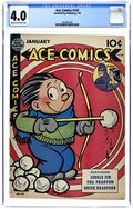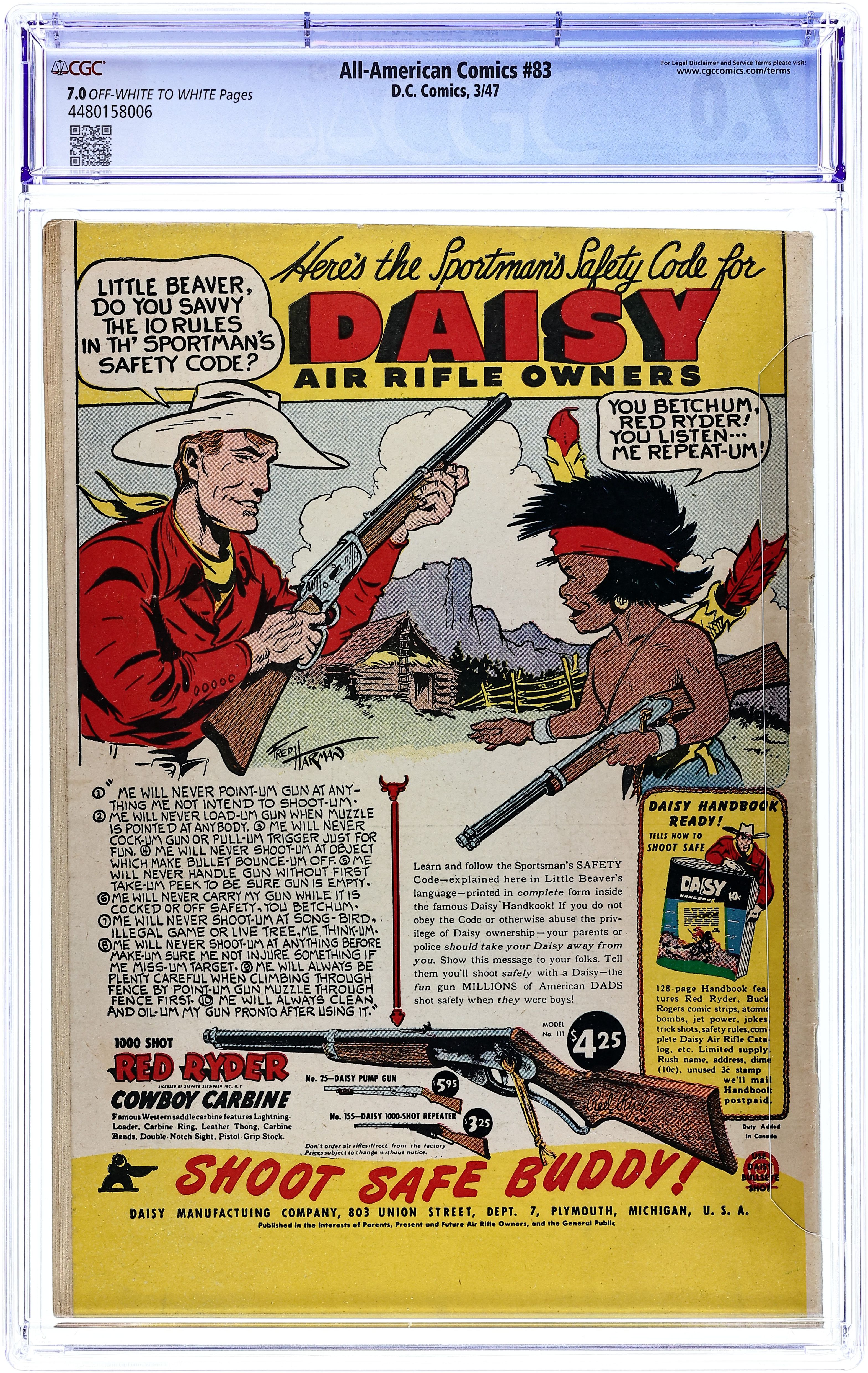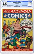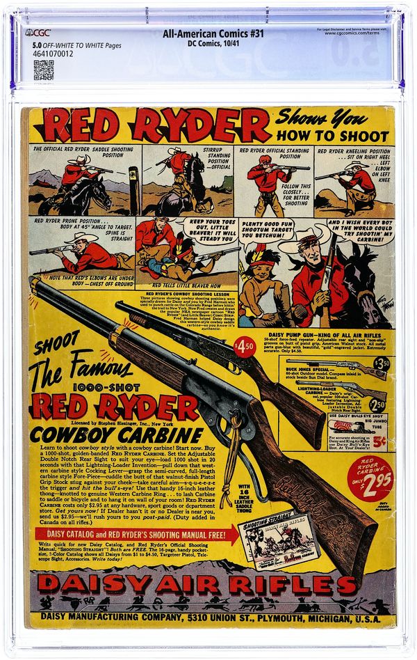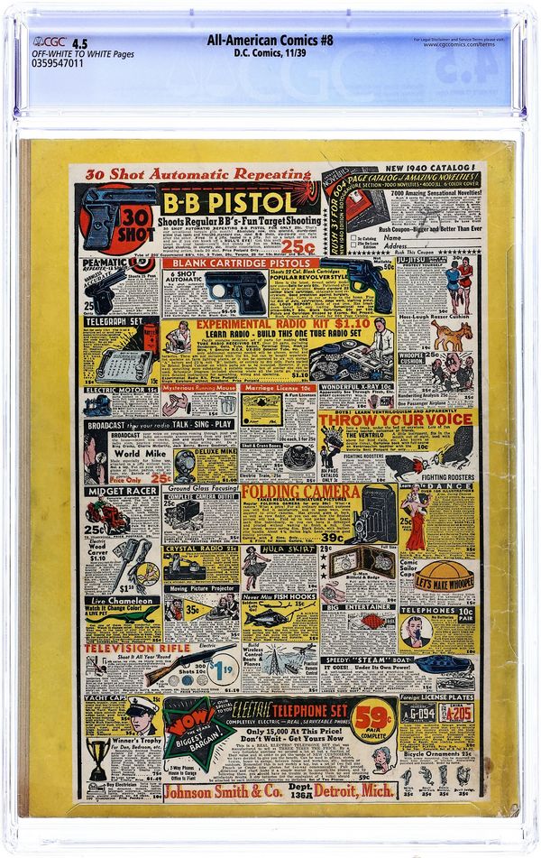 This issue features an ad with the first in-print mention of The Flash and Hawkman, pre-dating publication of Flash Comics #1! Cover art by Walter Galli, Jon L. Blummer, and William Smith. Origin, Part II starring Gary Concord, the Ultra-Man, script and art by Jon L. Blummer (signed as Don Shelby); Gary's father's story continues; He discovers he is the only one who can breathe the air outside the domed cities. Mutt and Jeff strips by Al Smith (as Bud Fisher). Believe It or Not by Robert L. Ripley. The Volcano starring Red, White and Blue, art by William Smith. Northern Lights starring Hop Harrigan, script and art by Jon L. Blummer (signed as Jon Elby). A Thousand Years A Minute - Part 3--Adventures in the Unknown, script by Carl H. Claudy, art by Stan Aschmeier. Scribbly Teaches the Principal, script and art by Sheldon Mayer. Calling the Roll starring Ben Webster, script and art by Edwin Alger. The American Way [Part 4], script by John B. Wentworth, art by Walter Galli. 68 pgs. $0.10. Cover price $0.10.