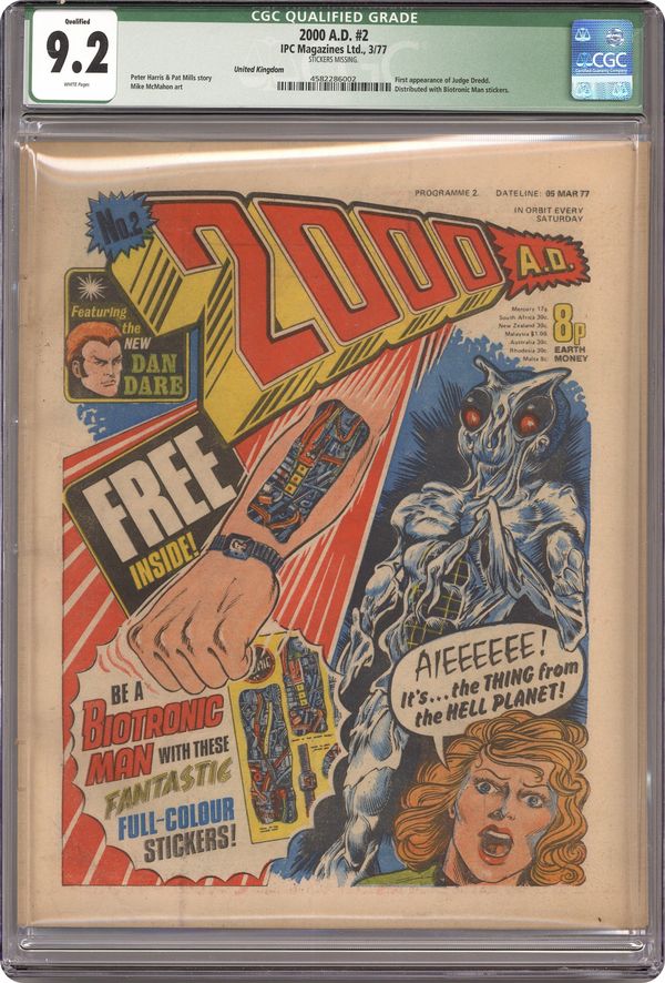 1st appearance of Judge Dredd. Contains bonus Biotronic Man Stickers. Cover by Massimo Belardinelli. March 5, 1977. Prog: 02 Featuring Invasion "The Resistance" (part 2 of 5), written by Gerry Finley-Day, art by Jesus Blasco; Bill Savage bursts into a bar and shoots some Volgs; a stranger observes with interest. Dan Dare (Part 2 of 11), written by Kelvin Gosnell, art by Massimo Belardinelli; Dan Dare fights his way to the commander of the Odyssey, Mr. Monday, to explain his fears about the alien presence in the red spot of Jupiter, only to have the alien itself materialize on the ship. Judge Dredd in "Judge Whitey" Written by Peter Harris, Art by Mike McMahon; Flesh: Book 1 (Part 2 of 19) Written by Ken Armstrong, Art by Boix; After criminal Whitey kills Judge Alvin, Dredd arrests him and sends him to Devil's Island, "a huge traffic island in the middle of a vast inter-city highway complex." Harlem Heroes (Part 2 of 27), written by Tom Tully, art by Carlos Trigo; As the Harlem Heroes tries to rebuild their team after the deadly crash, they take on old-timer Conrad King, and street aeroball player Zack Harper. M.A.C.H.1 "Vulcan" (Part 2 of 2) Written by Robert Flynn, Art by Ian Kennedy; John Probe dives from a RAF Nimrod onto the back of the flying Vulcan aircraft filled with nerve gas; Ripping his way inside, a terrorist's bullet punctures a container, causing hallucinations in our hero before he sets the Vulcan down safely in the Thames Mud Flats. 32 Pgs., B&W. 0.08 GBP.