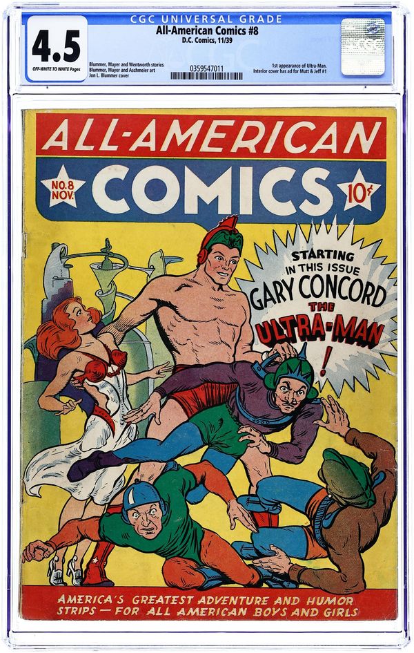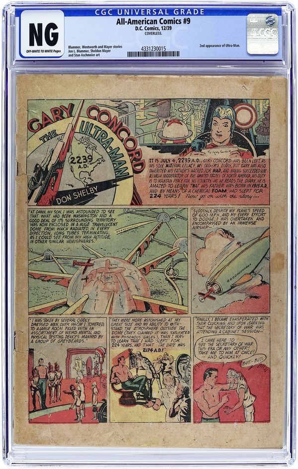 Cover art by Jon Blummer. Origin part 1 starring Gary Concord, the Ultra-Man, script and art y Jon Blummer [as Don Shelby]; Gary Concord's father spent years in suspended animation to awake in the far future of 2239AD. Mutt and Jeff strips by Al Smith (as Bud Fisher). Believe It or Not by Robert L. Ripley. Saboteur starring Red, White and Blue, pencils by William Smith, inks by Stan Aschmeier; Doris is captured by enemy agents when she discovers a plan to sabotage a new submarine. Hauling Nitro! starring Hop Harrigan, script and art by Jon Blummer [as John Elby]. A Very Funny Cartoon - to the right person starring Scribbly, script and art by Sheldon Mayer. Mystery Solved starring Ben Webster, script and art by Edwin Alger. The American Way (part 4), script by John Wentworth, art by Walter Galli. 68 pgs. $0.10. Cover price $0.10.