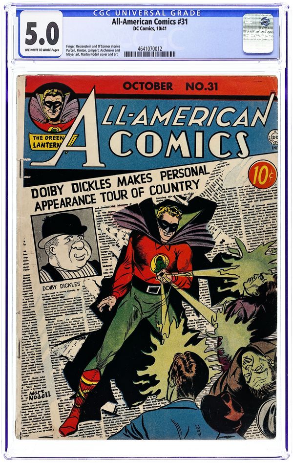 Cover art by Paul Reinman. Napoleon and Joe Safeen starring Green Lantern, art by Paul Reinman; An apparent insane asylum escapee uses his exceptional talent in mathematics to aid Joe Safeen's mob in a series of robberies. Curse of the Caliphs starring Dr. Mid-Nite, script by Joseph Greene, art by Stan Aschmeier. Red and Blooey Meet in China starring Red, White and Blue, script by John B. Wentworth, art by Dennis Neville. Hippity and His Off the Cob Dream of Conquest starring Hop Harrigan, script and art by Jon L. Blummer. Mutt and Jeff strips by Al Smith [signed as Bud Fisher]. 52 pgs. $0.10. Cover price $0.10.