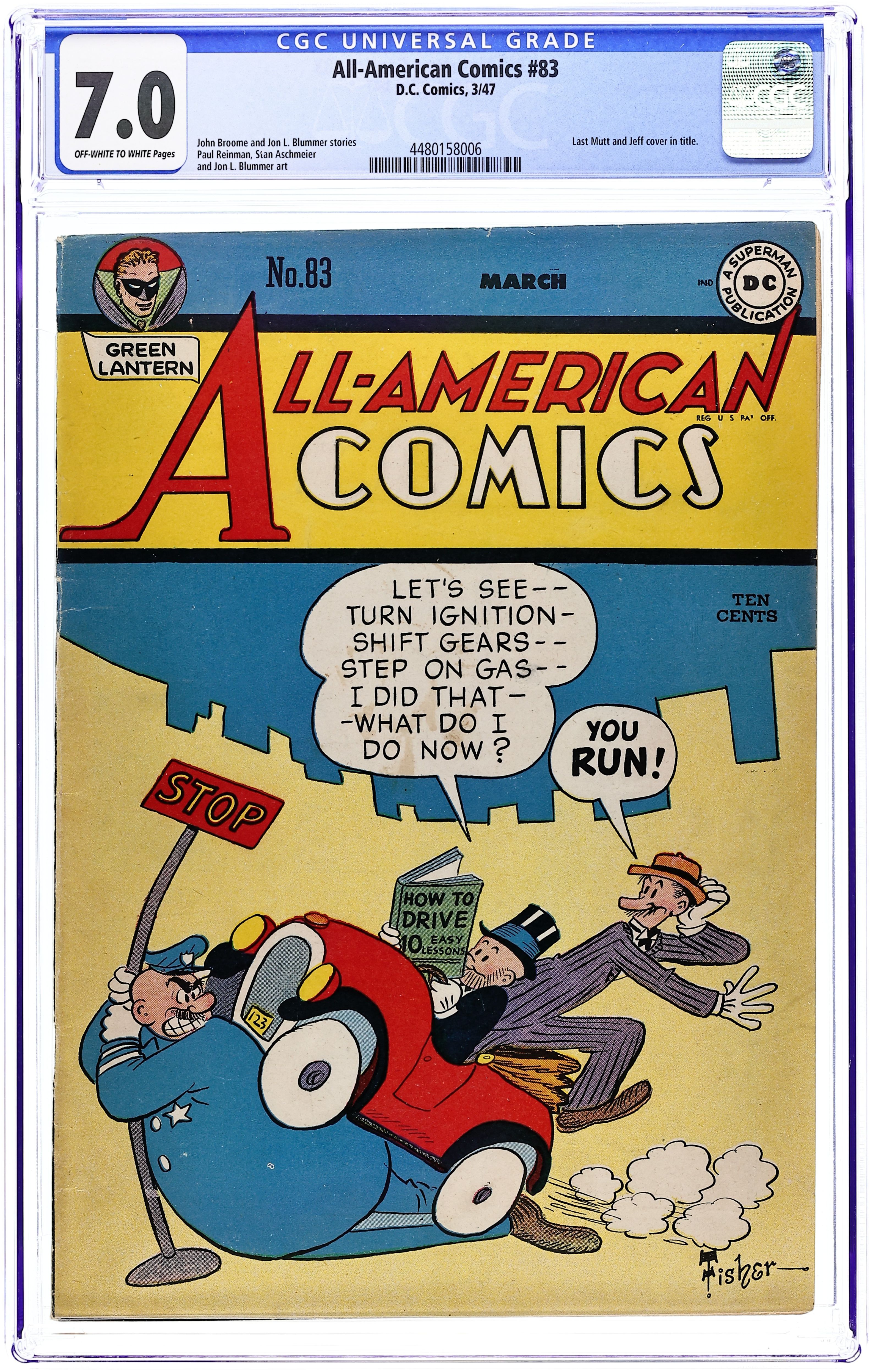 Cover art by Howard Purcell. The Case of the Loan Shark, script by Bill Finger, art by Irwin Hasen [as Mart Dellon]; After Carl Kessor tells him how loan shark Richard Turpin falsified loan documents to keep Kessor paying long after his debt should have been cleared, Alan Scott hatches a plan to expose Turpin; As Green Lantern, he offers himself as Turpin's enforcer, convinces Turpin's men to testify against their boss, then gets Turpin to explain his crimes within earshot of the police. The Crazy Man starring Scribbly and the Red Tornado, script and art by Sheldon Mayer. The Guardian Angel starring Hop Harrigan, script and art by Jon L. Blummer; Hop becomes the Guardian Angel to help Ikky and Prop capture spies outside American territory. The Secret of Mr. Connelly starring The Atom, script by Bill O'Connor, pencils by Ben Flinton, inks by Leonard Sansone. The Waterfront Mystery starring Dr. Mid-Nite, script by Charles Reizenstein, art by Stan Aschmeier. The Ruby of Life starring Sargon the Sorcerer, script by John B. Wentworth, art by Howard Purcell. Koval's Invention starring Red, White and Blue, script by John B. Wentworth, art by Howard Purcell. Mutt and Jeff strips by Al Smith (as Bud Fisher). 68 pgs. $0.10. Cover price $0.10.