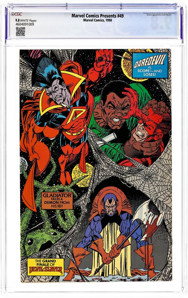 Cover art by Erik Larsen and Terry Austin. Life's End Part 2: Child's Play starring Wolverine and Spider-Man, script and pencils by Erik Larsen, inks by Joe Rubinstein. Lost Souls Part 4: The End of...Devil Slayer starring Devil Slayer, script by Dwight Zimmerman, pencils by Rodney Ramos, inks by Mark McKenna. White Messiah starring Daredevil, script by John Figeroa, pencils by Ron Wilson, inks by Jeff Albrecht. The Unbeatable Foe starring Gladiator, script by Len Kaminsky, pencils by Don Heck, inks by Vince Mielcarek. 36 pgs. Cover price $1.25.