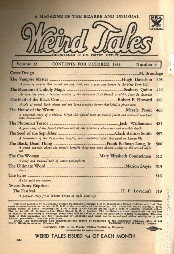 Volume 22, Issue 4 - October 1933. Edited by Farnsworth Wright. Horror and Fantasy stories in the pulp style. 6.75-in. x 10-in.; 128 newsprint pages, text (with B&W illustrations). Cover price $0.25.