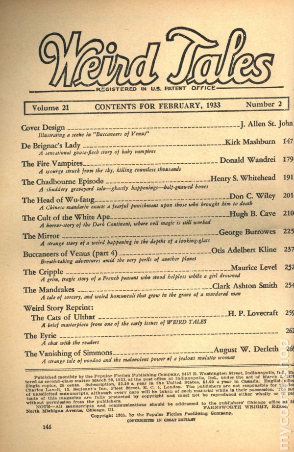 Volume 21, Issue 2 - February, 1933. Edited by Farnsworth Wright. Horror and Fantasy stories in the pulp style. 6.75-in. x 10-in.; 128 newsprint pages, text (with B&W illustrations). Cover price $0.25.