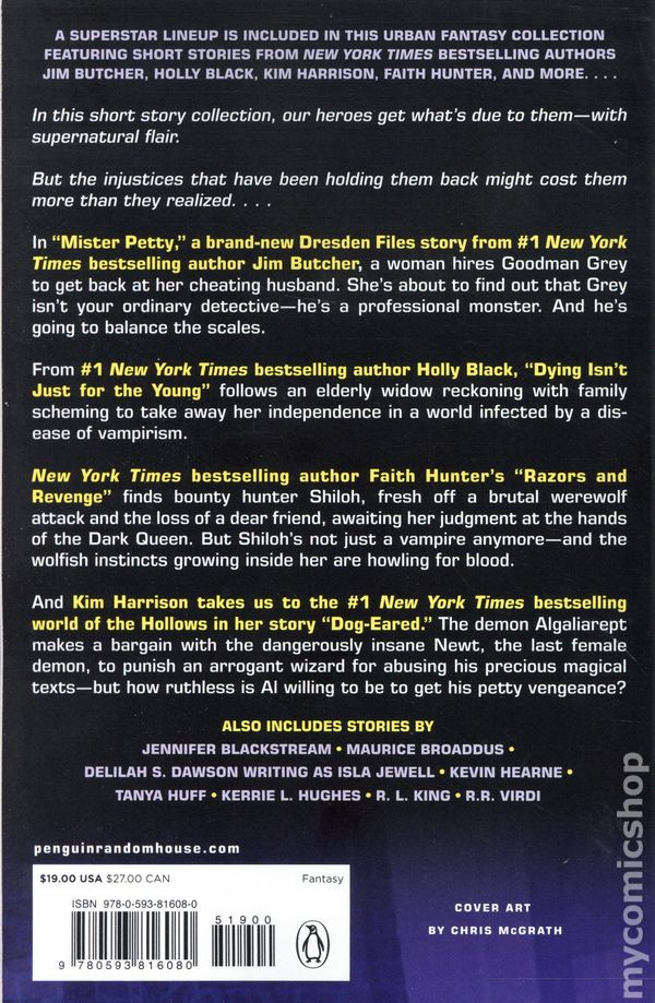 1st printing. Edited by Jim Butcher and Kerrie L. Hughes. Stories by Jim Butcher, Kevin Hearne, Holly Black, Delilah S. Dawson, Tanya Huff, Jennifer Blackstream, Maurice Broaddus, Kim Harrison, Faith Hunter, R. L. King, R.R. Virdi, and Kerrie L. Hughes. Cover by Chris McGrath. Introduction by Jim Butcher. Foreword by Kerrie L. Hughes. A superstar lineup is included in this urban fantasy collection featuring short stories from New York Times bestselling authors Jim Butcher, Holly Black, Kim Harrison, Faith Hunter, and more … In this short story collection, our heroes get what's due to them—with a supernatural flair. But the injustices that have been holding them back might cost them more than they realized. . . . In Mister Petty, a brand-new Dresden Files story from #1 New York Times bestselling author Jim Butcher, a woman hires Goodman Grey to get back at her cheating husband. She's about to find out that Grey isn't your ordinary detective—he's a professional monster. And he's going to balance the scales. From #1 New York Times bestselling author Holly Black, Dying Isn't Just for the Young follows an elderly widow reckoning with family scheming to take away her independence in a world infected by a disease of vampirism. New York Times bestselling author Faith Hunters Razors and Revenge finds the vampire bounty hunter Shiloh awaiting her judgement at the hands of the Dark Queen, fresh off a brutal werewolf attack and the loss of a dear friend. But Shiloh's not just a vampire anymore—and the wolfish instincts growing inside her are howling for blood. And Kim Harrison takes us to the #1 New York Times bestselling series of the Hollows in her story Dog-eared. The demon Algaliarept makes a bargain with the dangerously insane Newt, the last female demon, to punish an arrogant wizard for abusing his precious magical texts—but how ruthless is Al willing to be to get his petty vengeance? ALSO INCLUDES STORIES BY Jennifer Blackstream * Maurice Broaddus * Delilah S. Dawson * Kevin Hearne * Tanya Huff * Kerrie L. Hughes * R. L. King * R.R. Virdi Softcover, 5 1/2-in. x 7-in., 352 pages, Text Only. Cover price $19.00.