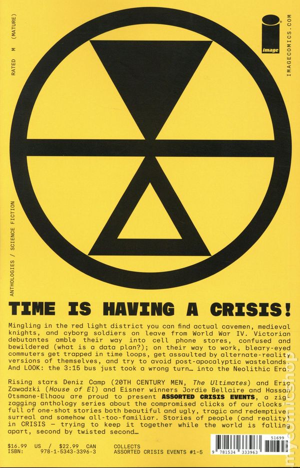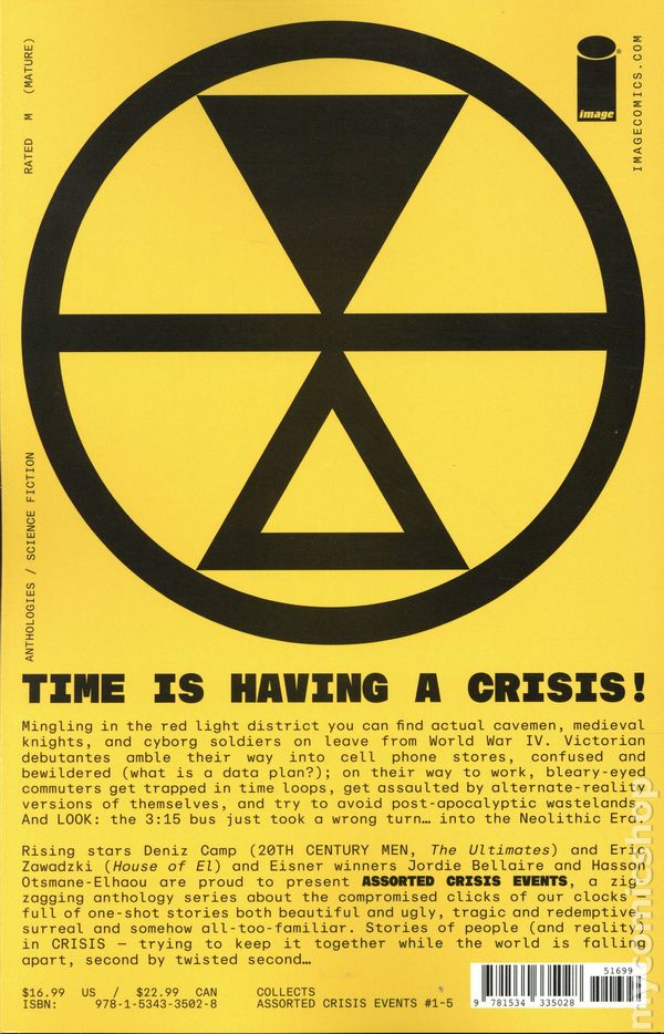 Volume 1 - 1st printing. Assorted Crisis Events (2025 Image) #1-5. Written by Deniz Camp. Art and Cover by Eric Zawadzki. An action-packed sci-fi anthology series following normal people navigating an alternate world where time is having a crisis, and just stepping outside your door can send you on an unexpected adventure. Time is having a crisis. Mingling in the red-light district, you can find actual cavemen, medieval knights, and cyborg soldiers on leave from World War IV. Victorian debutantes amble their way into cell phone stores, confused and bewildered (what is a data plan?). On their way to work, bleary-eyed commuters get trapped in time-loops, assaulted by alternate-reality versions of themselves, and try to avoid post-apocalyptic wastelands. And LOOK: the 3:15 bus just took a wrong turn…into the neolithic era. Rising stars** DENIZ CAMP** (20TH CENTURY MEN, The Ultimates) and ERIC ZAWADZKI (House of El) and Eisner winners JORDIE BELLAIRE and HASSAN OTSMANE-ELHAOU are proud to present ASSORTED CRISIS EVENTS, an ongoing, zig-zagging anthology series about the compromised clicks of our clocks—full of one-shot stories both beautiful and ugly, tragic and redemptive, surreal and somehow all too familiar. Stories of people (and reality) in CRISIS—trying to keep it together while the world is falling apart, second by twisted second… Softcover, 208 pages, full color. Mature Readers Cover price $16.99.