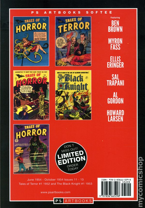 Volume 3 - 1st printing. "June-October 1954/195/1953!" Collects Tales of Horror (1952-1954 Toby/Minoan) #11-13 (June-October 1954), Tales of Terror (1952 Toby #1, and The Black Knight (1953 Toby Press) #1. Cover by Ben Brown and David Gantz. Toby Press was a small but respectable comics publisher, which also used the imprint Minoan; they put out one issue of Tales of Terror, then got hit by a cease-and-desist order from E.C., which used that title for their annuals (don't worry we'll bring you that particular issue later on). Toby dropped that and started over with Tales of Horror, which ran for 13 issues. Toby may be the only comics publisher to swipe the urbane and cynical stories of John Collier, rather than relying on Poe, Lovecraft, and the like. Softcover, 184 pages, full color. Cover price $32.99.