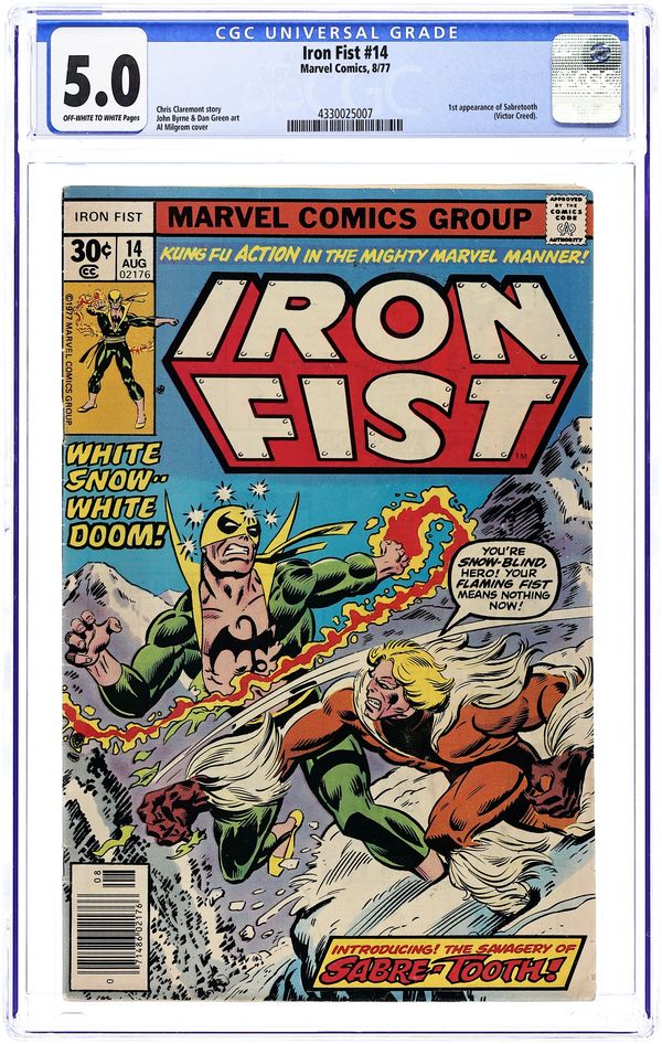 35 cent cover variant. 1st appearance of Sabretooth - next appearance is in Power Man and Iron Fist # 66. "Snowfire!" Guest-starring Colleen Wing. Story by Chris Claremont. Art by John Byrne and Dan Green. Lost and wounded somewhere in the Canadian wilderness, Iron Fist must summon all his energy and skills to survive an encounter with the deadly man called Sabretooth. Cover price $0.35.