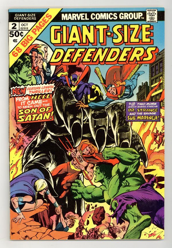 Starts Mar 2 Cover pencils by Gil Kane and John Romita (alterations), inks by Klaus Janson and John Romita (alterations). New story: "H... as in Hulk... Hell... and Holocaust!", script by Len Wein, pencils by Gil Kane (layouts/breakdowns) and Klaus Janson (finished art), inks by Klaus Janson; The Defenders, with the help of the Son of Satan stop Asmodeus and Satannish. Reprints: "Sub-Mariner" starring Betty Dean, script and art by Bill Everett. "Black Knight," art by Fred Kida. "Beyond the Purple Veil!", script by Stan Lee, art by Steve Ditko; Doctor Strange must rescue two thieves who unwittingly steal a magic gem from him and are trapped in a mystical dimension as a result. 68 pgs., full color. $0.50. Cover price $0.50.