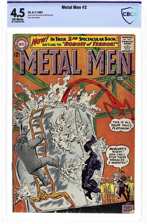 Cover pencils by Ross Andru, inks by Mike Esposito. Robots of Terror!, script by Bob Kanigher, pencils by Ross Andru, inks by Mike Esposito; Platinum builds a robot duplicate of Doc Magnus who in turn build a new set of Metal Men. 36 pgs. $0.12. Cover price $0.12.