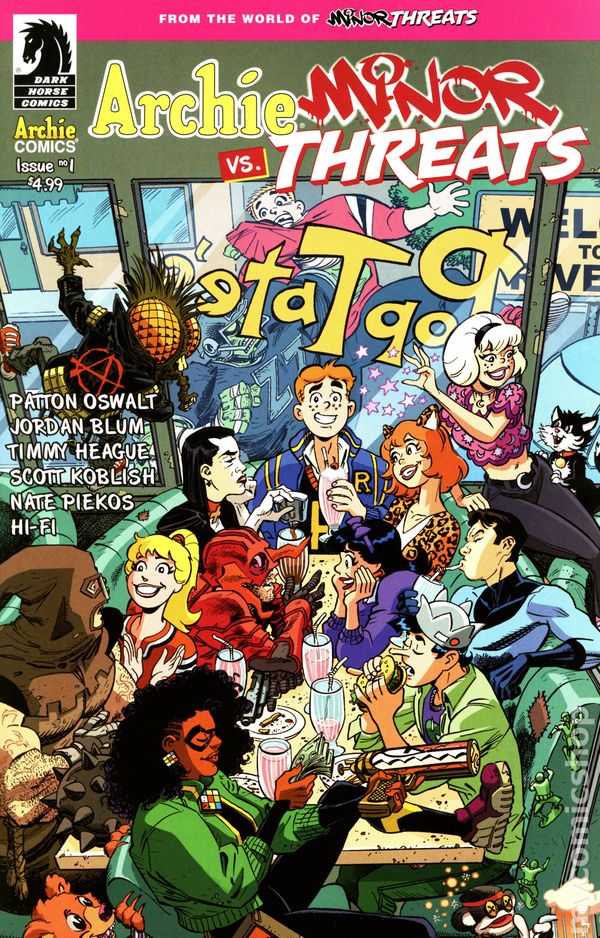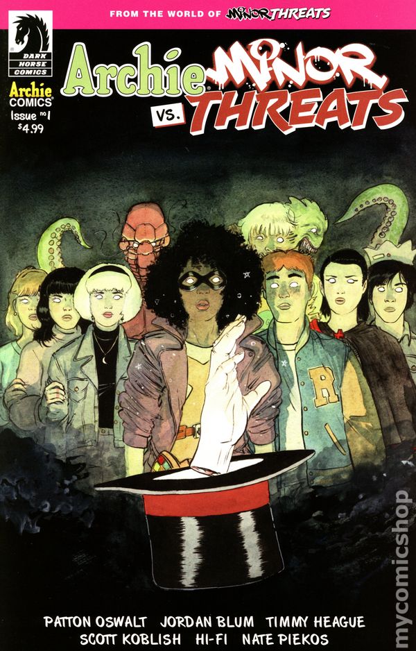 Written by Patton Oswalt; Jordan Blum; Timmy Heague. Art by Scott Koblish. Cover by Scott Koblish, Hi-Fi. Not a hoax! Not a dream! The fun-loving teens of Riverdale collide with the crooked super-criminals of Twilight City in the most bombastic crossover of the year! It's your favorite high schoolers forced to FIGHT your favorite costumed villains in a story that will have lasting ramifications on all involved! ARCHIE, BETTY, VERONICA, JUGHEAD and friends are on on their way to a field trip to Twilight City when the magical meddling of SABRINA THE TEENAGE WITCH lands them in the seedy underbelly of Redport, the most villainous part of town controlled by Frankie Follis AKA PLAYTIME and her gang of MINOR THREATS. Archie and the others suddenly find themselves drafted into both sides of the war Playtime is waging against magic users in her turf. One thing is for sure . . . blood and milkshakes will be spilled! Issue one of the four issue mini is written by Minor Threats co-creators Patton Oswalt and Jordan Blum with Timmy Heague (Archie Comics' Fear the Funhouse: Toybox of Terror) and art by Scott Koblish (Deadpool).• Four issue series. 28 pages, full color. Cover price $4.99.