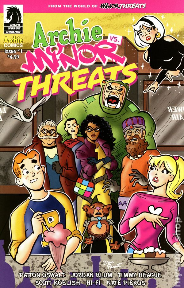 Written by Patton Oswalt; Jordan Blum; Timmy Heague. Art by Scott Koblish. Cover by Dan Parent. Not a hoax! Not a dream! The fun-loving teens of Riverdale collide with the crooked super-criminals of Twilight City in the most bombastic crossover of the year! It's your favorite high schoolers forced to FIGHT your favorite costumed villains in a story that will have lasting ramifications on all involved! ARCHIE, BETTY, VERONICA, JUGHEAD and friends are on on their way to a field trip to Twilight City when the magical meddling of SABRINA THE TEENAGE WITCH lands them in the seedy underbelly of Redport, the most villainous part of town controlled by Frankie Follis AKA PLAYTIME and her gang of MINOR THREATS. Archie and the others suddenly find themselves drafted into both sides of the war Playtime is waging against magic users in her turf. One thing is for sure . . . blood and milkshakes will be spilled! Issue one of the four issue mini is written by Minor Threats co-creators Patton Oswalt and Jordan Blum with Timmy Heague (Archie Comics' Fear the Funhouse: Toybox of Terror) and art by Scott Koblish (Deadpool).• Four issue series. 28 pages, full color. Cover price $4.99.