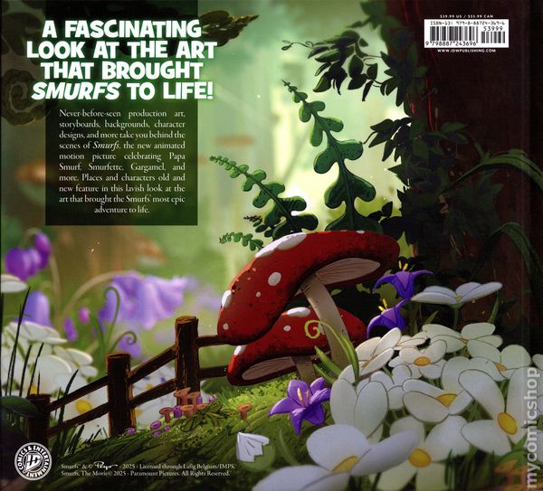 1st printing. By Matt Murray. Cover by Margaret Wuller. The Smurfs are back! Get a behind-the-scenes look at the art that went into the making of the new movie, releasing July 2025! Journey into the world of Smurfs with fresh takes on well-known characters such as Smurfette, Papa Smurf, Grouchy Smurf, Gargamel, and Azrael, as well as a few brand-new faces. Visit some familiar locations-such as Smurf Village, Smurfberry Glade, and Gargamel's Evil Workshop, and take a tour of some new places as well! See how the art was developed, from concept to final, creating the animated wonder that ended up on the screen. This hardcover measures 11" x 12", showcasing the beauty of the art and giving fans an opportunity to revisit their favorite characters and locations from the film. Hardcover, 12-in. x 11-in., 176 pages, full color. Cover price $39.99.