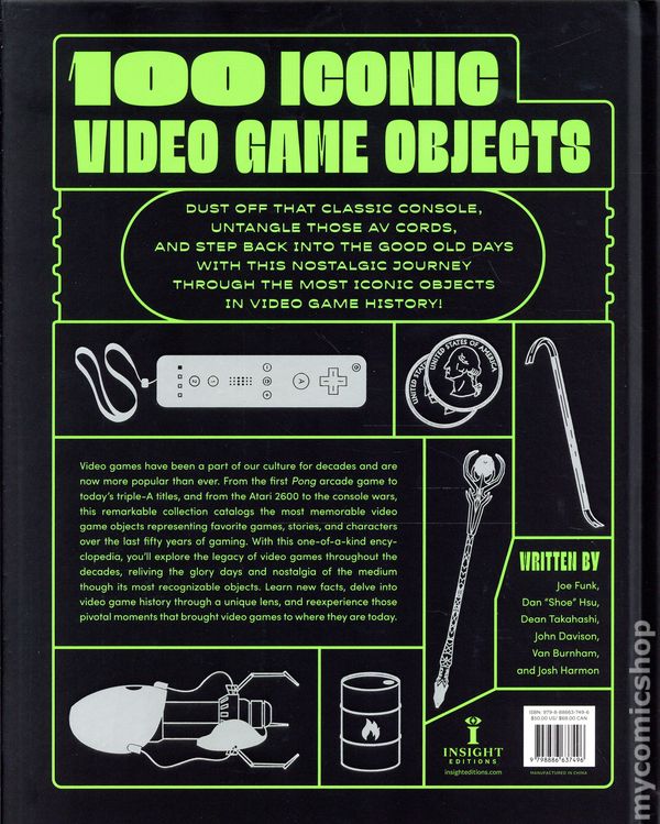 1st printing. By Joe Funk, Dan "Shoe" HSU, Dean Takahasi, John Davison, Van Burnham, and Josh Harmon. Video games have been a part of our culture for decades and are now more popular than ever. From the first Pong arcade game to Halo: Combat Evolved, and from the Atari 2600 to todays console wars, this remarkable collection catalogs the most iconic video game objects representing our favorite games, stories, and characters over the last fifty years of gaming. With this one-of-a-kind encyclopedia, you'll explore the legacy of video games throughout the decades, reliving the glory days and nostalgia of the medium though its most recognizable iconography. Learn new facts, delve into video game history, and reexperience those special moments that brought video games to where they are today. Hardcover, 8 1/2-in. x 12-in., 176 pages, full color. Cover price $50.00.