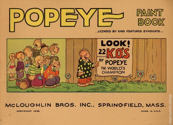 #2052 Paint Book by E. C. Segar. The pages feature large single panels to be colored in and most pages also have a fully colored panel at the top with the exact same art for guidance. The world's K.O. champion, Popeye knocks out opponent after opponent. Cardboard softcover, 9 7/8" x 13" horizontal format, 28 pages-cover to cover.