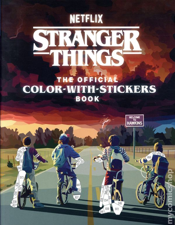 1st printing. Art and cover by Liam Brazier. A fun and stress-relieving activity for Stranger Things lovers of all ages, featuring twelve iconic images from the hit show that come to life by piecing together stickers—perfect for coloring book and puzzle fans! Relaxing like a coloring book, but engrossing like a puzzle, this color-with-stickers activity book allows you to relive your favorite Stranger Things moments and channel your feelings about the final season into some 80s-like low-tech fun. It's like color by numbers but with stickers! Featuring original illustrations, easy-to-use pages of numbered stickers, and thick paper with perforated pages, this activity book is a unique gift for Stranger Things fans. Softcover, 8 1/2-in. x 11-in., 80 pages, full color. Cover price $18.99.