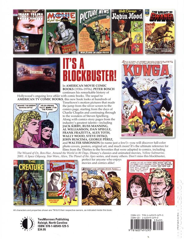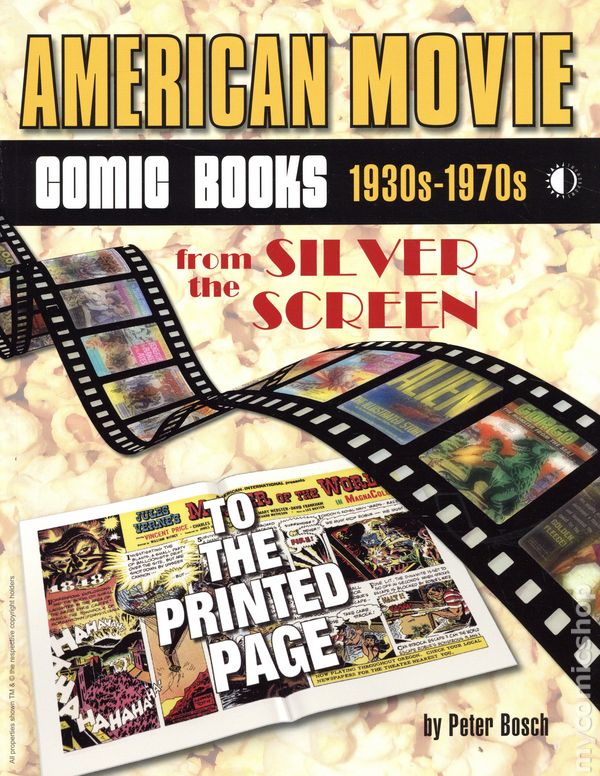 1st printing. By Peter Bosch. In AMERICAN MOVIE COMIC BOOKS (1930s-1970s), author PETER BOSCH continues his remarkable history of Hollywoods ongoing love affair with comic books. The sequel to AMERICAN TV COMIC BOOKS, this new book looks at hundreds of Tinseltowns motion pictures that made the jump from the silver screen to the comics page, starting from the days of Charlie Chaplin and continuing through to the wonders of Steven Spielberg. Along with comics story pages from the industrys greatest talents—including JACK KIRBY, RUSS MANNING, AL WILLIAMSON, FRANK FRAZETTA, ALEX TOTH, DAN SPIEGLE, WALLACE WOOD, STEVE DITKO, JOHN BUSCEMA, GEORGE PÉREZ, and WALTER SIMONSON (to name just a few!)—you will discover full-color photo covers, posters, original art, and much more! Its the ultimate reference for films from the Thirties to the Seventies that were adapted to comics, including The Wizard of Oz, Ben-Hur, Around the World in 80 Days, Disneys cinema classics and animated movies, Yellow Submarine, 2001: A Space Odyssey, Star Wars, Alien, The Planet of the Apes series, and many others. Dont miss this blockbuster, perfect for anyone who enjoys movies and comics alike! Softcover, 8 1/2-in. x 11-in., 192 pages, full color. Teen Cover price $34.95.