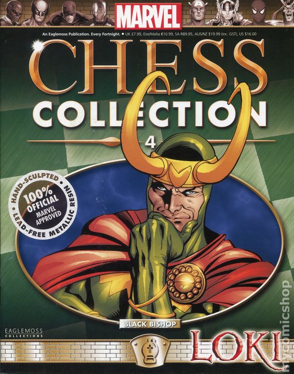 #04 Loki (Black Bishop) - NOTE: Magazine Only - The Marvel Chess Collection is a new bi-monthly series offering the comic fan and chess lover alike the chance to collect a uniquechess set, featuring some of the greatest and most loved Marvel characters. The first set in the Marvel Chess Collection consists of the greatest heroes and villains from across the Marvel Universe. Will Spider-Man survive against Venom? Can Captain America overcome the villainous Red Skull? Or will the forces of evil defeat the assembled heroes? With the Marvel Chess Collection the battle is in your hands! Slick card-stock cover, 16 pages, 8 1/2-in. x 11-in., full color. Slick card-stock cover, 16 pages, 8 1/2-in. x 11-in., full color.