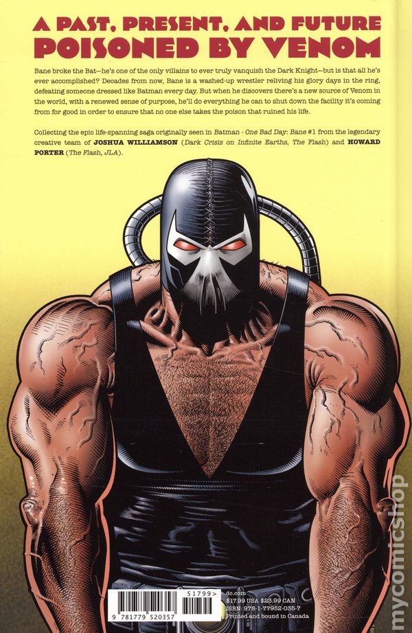 2nd and later printings. Written by Joshua Williamson. Art and cover by Howard Porter. A PAST, PRESENT, AND FUTURE DESTROYED BY VENOM! Bane broke the Bat--he's one of the only villains to ever truly vanquish the Dark Knight--but is that all he's ever accomplished? Decades from now, Bane is a washed-up wrestler reliving his glory days in the ring, defeating someone dressed like Batman every day. But when he discovers that there's a new source of Venom in the world, he'll do everything he can to shut down the facility it's coming from for good and make sure that no one takes the poison that ruined his life. An epic saga set throughout Bane's life, expanding on the hopes, dreams, regrets, and failures of one of DC's most legendary villains, brought to you by the iconic creative team of Joshua Williamson (Dark Crisis on Infinite Earths, The Flash) and Howard Porter (The Flash, Justice League). Hardcover, 88 pages, full color. Rated Teen+ Cover price $17.99.