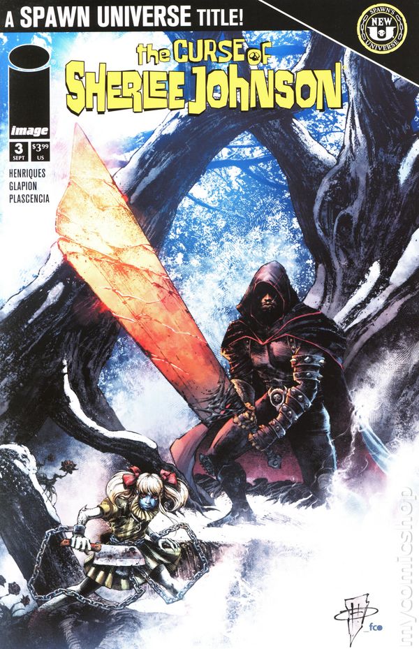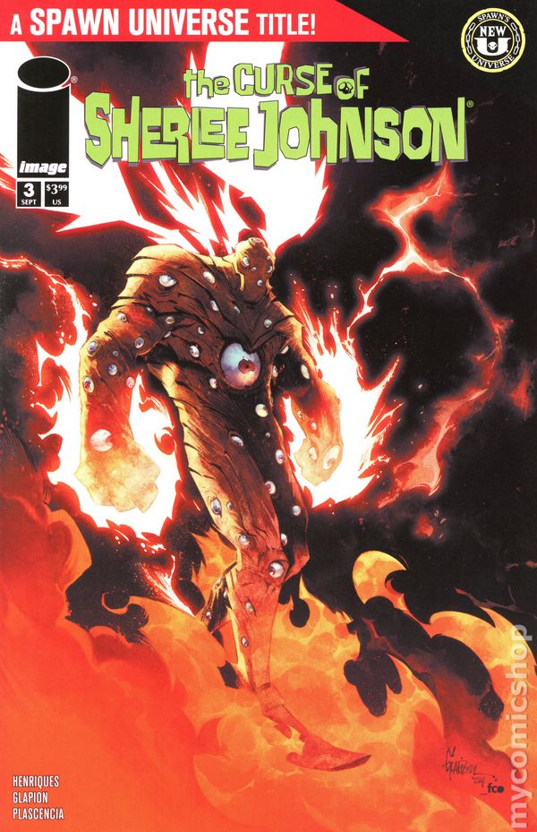 Second Printing. Written by Daniel Henriques. Art by Jonathan Glapion. Cover by Jonathan Glapion. **SERIES PREMIERE ** What happened to Sherlee Johnson, the seven-year-old victim of the infamous serial killer Billy Kinkaid? THE CURSE OF SHERLEE JOHNSON, an epic new chapter in the Spawn Universe, explores the fate of the innocent young girl. Her harrowing adventures with the Stranger are laid bare as her story and the world she now inhabits is revealed. With a story conceived in the twisted mind of DANIEL HENRIQUES and interior art by celebrated artist JONATHAN GLAPION, the reader will explore parts of the Spawn Universe never before seen. 48 pages, full color. Cover price $5.99.