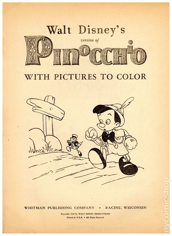 View scansCocomalt Promotional Story Coloring Book. Title page is "Walt Disney's version of Pinocchio With Pictures To Color". In this 48 page text story, Disney takes on the classic story about the wooden boy who wanted to be human and adds a single drawing to each page (Pinocchio, Gepetto, Jiminy Cricket, and others) to be colored in by the reader. Inside back cover has a full page Cocomalt ad. 8 1/2" x 11 3/8", softcover, b&w, 96 pages.